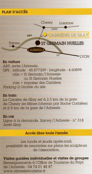 A 25 km du centre de Lyon et 20 km de Villefranche sur Saône, le site des Carrières de Glay se situe sur la commune de St Germain Nuelles (ex Saint Germain sur l'Arbresle).