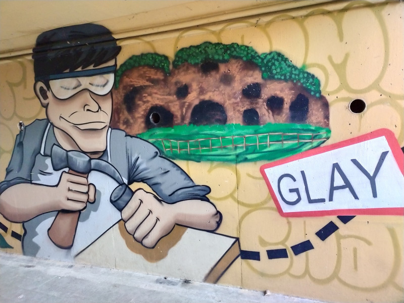 Un Tag sur le mur du passage souterrain à Chessy les mines représentant le site des carrières de Glay.