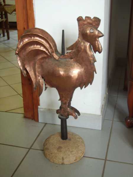 Coq en cuivre et fer forgé sur pied en pierre dorée
